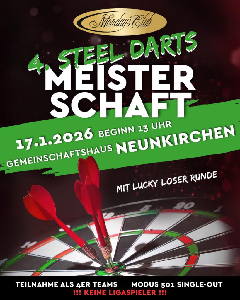 Ab sofort könnt ihr euch für die Dartsmeisterschaft am 17.01.2026 in Neunkirchen anmelden → klick mich
